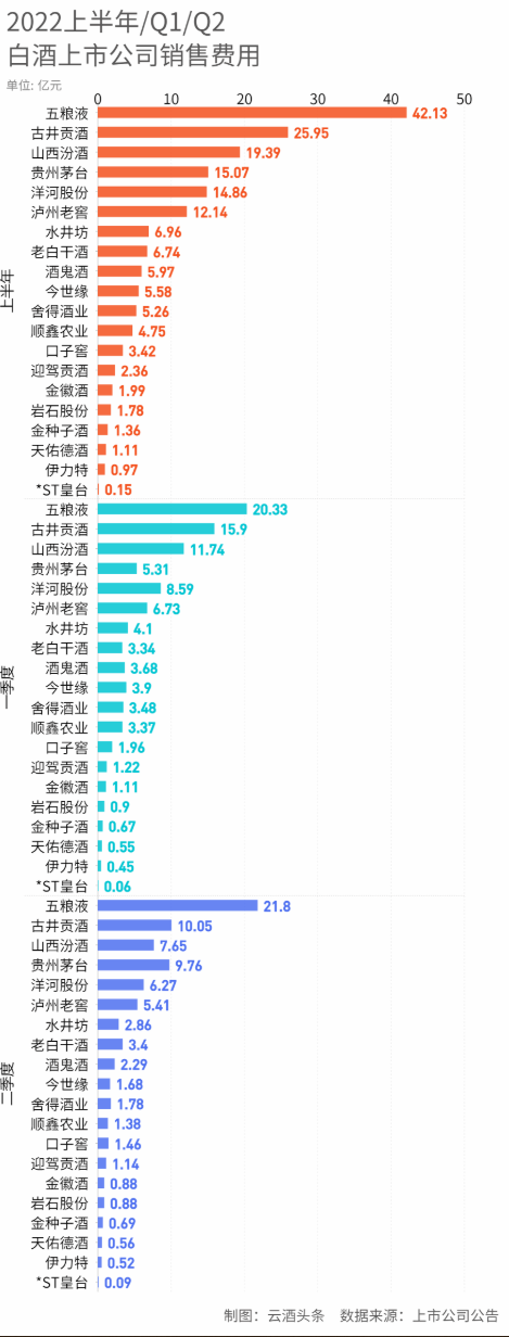其中,上半年五粮液销售费用最高,达42.13亿元,同比增长18.48;二季度中古井贡酒销售费用最高,为10.05亿元。而从二季度业绩来看,古井贡酒营收同比增长29.58%,利润同比增长177.12%,利润增幅最大。