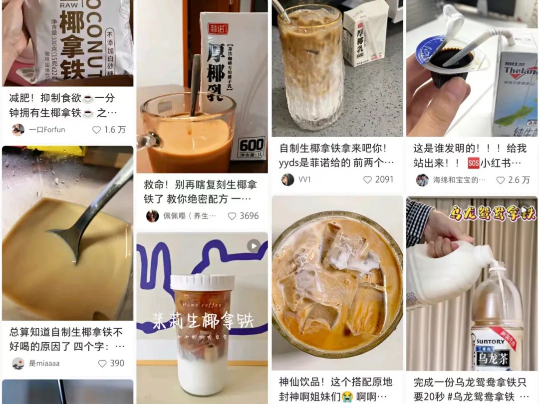 对比验证下来,一款咖啡的火爆程度,和自制咖啡的传播率是成正比关系的。比如,“自制生椰拿铁”在小红书的打卡笔记达到了3万+篇。
