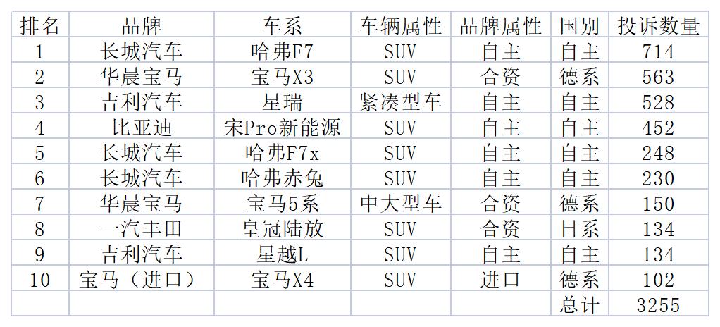具体来看,在8月的质量投诉中,长城汽车旗下车型投诉量出现显著增长,在投诉榜前十中占据三席(按数量由多至少分别为哈弗F7、哈弗F7x和哈弗赤兔,在投诉前十总计超3200宗投诉中占比超36%,共计投诉超过1100宗)。