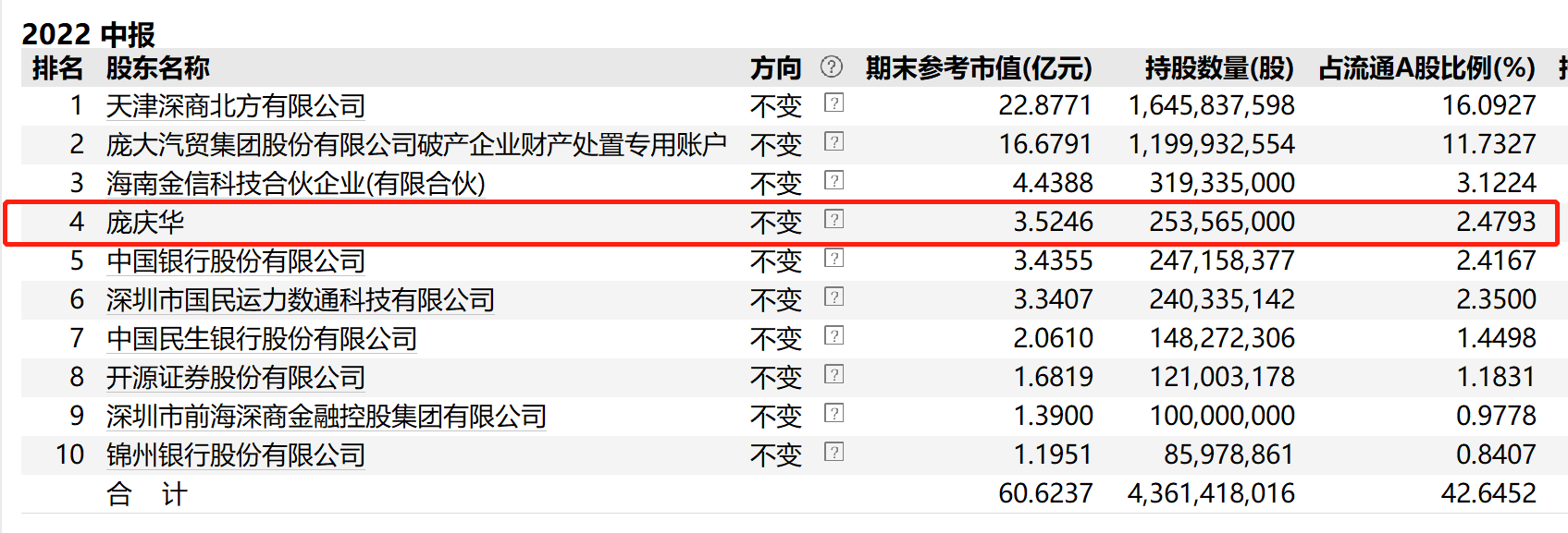值得一提的是,这笔股权也是当前庞庆华所持有庞大集团的几乎全部股份。据wind数据显示,截至2022年上半年,庞庆华所持有庞大集团的流通股股份总数为2.5356亿股,占流通股比例为2.48%,位居公司第四大股东。