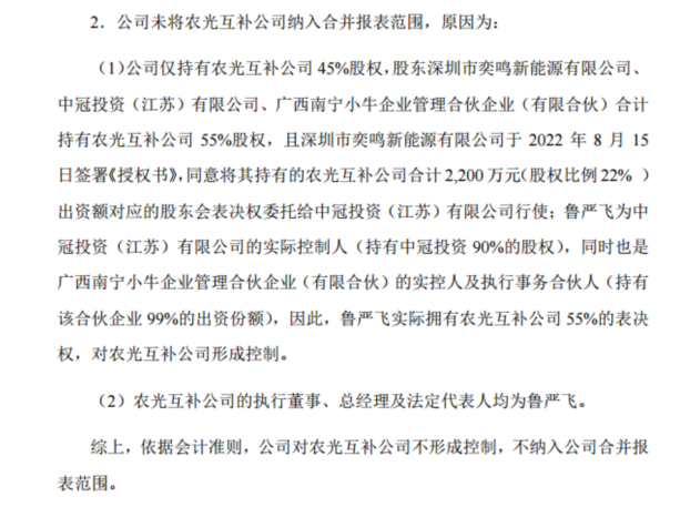 根据公告,作为第一大股东的皇氏集团之所以未将农光互补并表、未获得其控制权,是由于其他两名股东中冠投资、南宁小牛均是鲁严飞的持股公司,再加上在8月15日新加入的第二大股东奕鸣新能源将22%投票权授权给了鲁严飞,这样鲁严飞便成为农光互补的实际控制人。