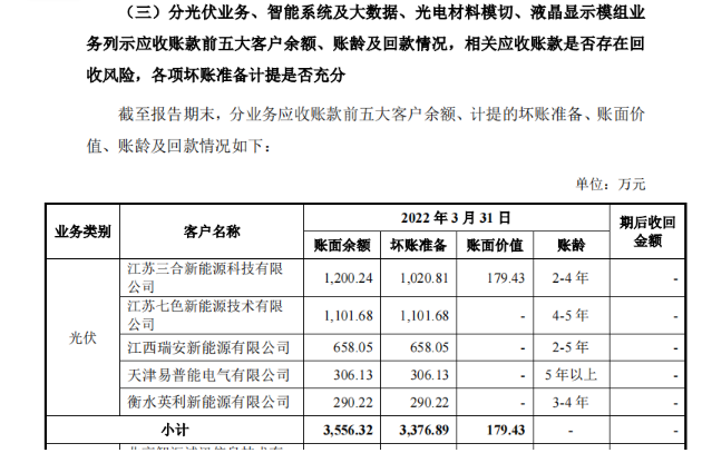 在锦富技术的2022年半年报及相关问询函中,其光伏业务的应收账款第一大、第二大客户便是上述潘孝争的关联公司江苏三合及江苏七色,两家公司涉及金额均在千万元以上,而鲁金明、鲁严飞共同任职的阳光普世也被列为长期应收款坏账对象,目前,上述应收款已悉数计提坏账。
