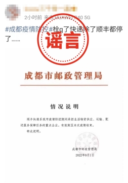近日,网上微博和留言,内容提及“成都疫情防控栓q了快递除了顺丰都停了……”“反正今天顺丰不派送,刚问过疫情防控需要,成华区”等相关消息引发关注。对此,成都市邮政管理局网站9月2日发布声明表示,该消息纯属捏造,系网络谣言!