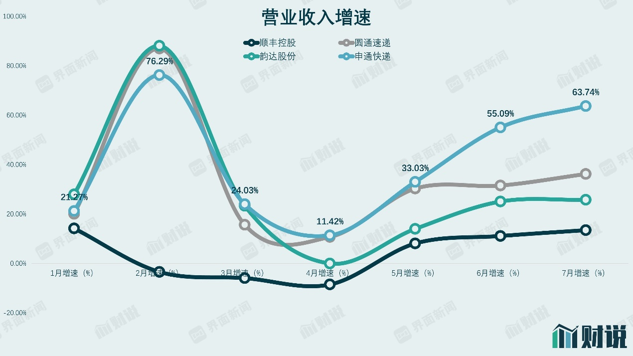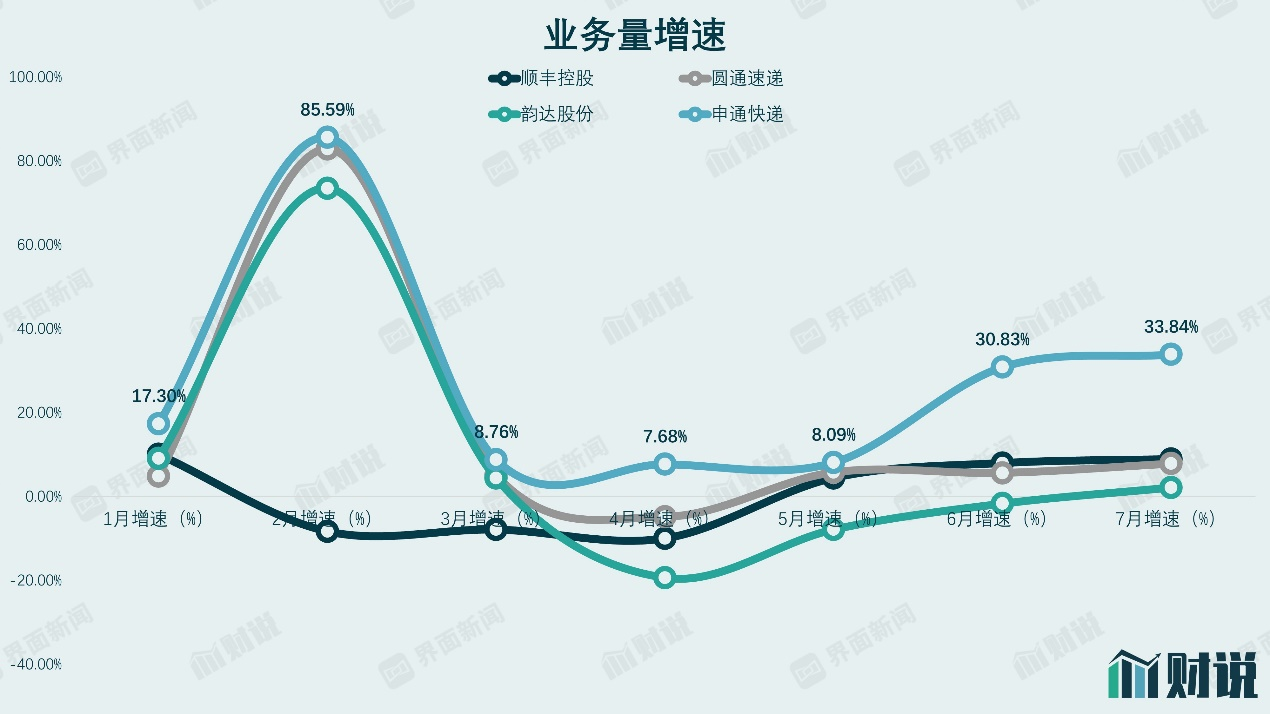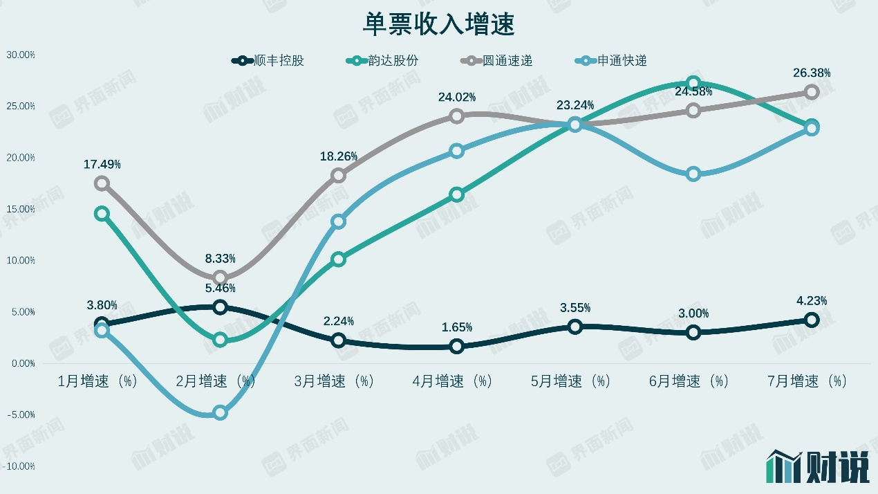 从最新披露的7月份快递企业经营数据可以看到,综合单票收入增速、业务量增速以及营业收入增速这三项数据,圆通速递上半年保持持续强劲,申通快递后来居上,顺丰控股持续低迷且未有明显反转,而韵达股份则有些虎头蛇尾。