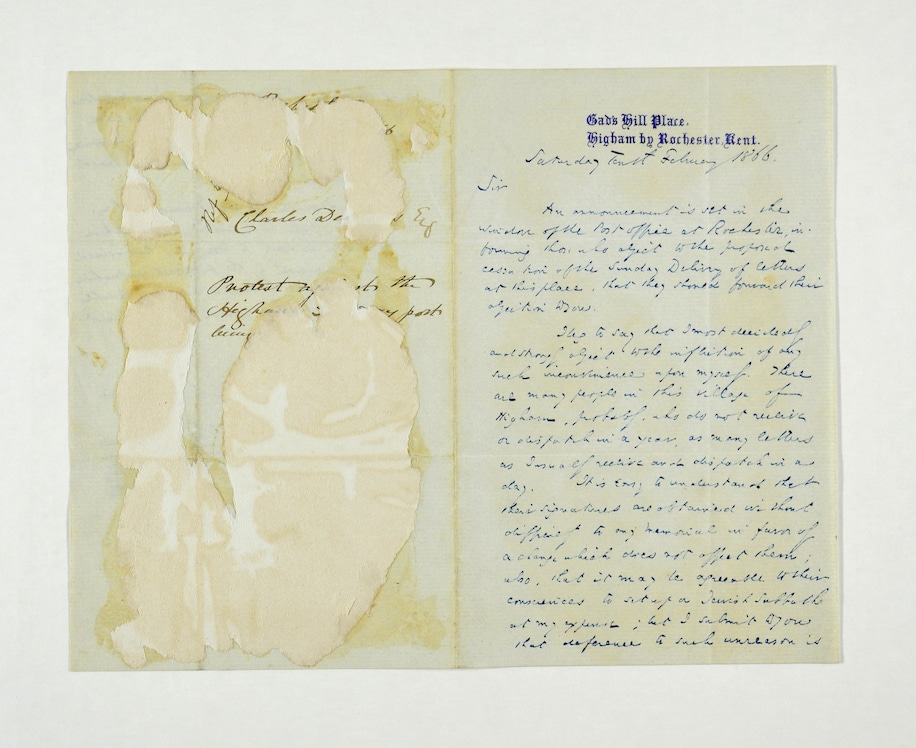 这11封信件此前从未公开展出,内容各不相同,从中我们可以瞥见狄更斯的阅读以及写作习惯,以及他不为人知的生活细节。比如他在其中一封信件中表达了对可能暂停周日邮政服务的不满。在这封收件人为IH·纽曼(I.H. Newman)的信里,狄更斯“耍起了大牌”,试图利用自己的名人身份“威胁”当地邮政机构继续周日送件服务: