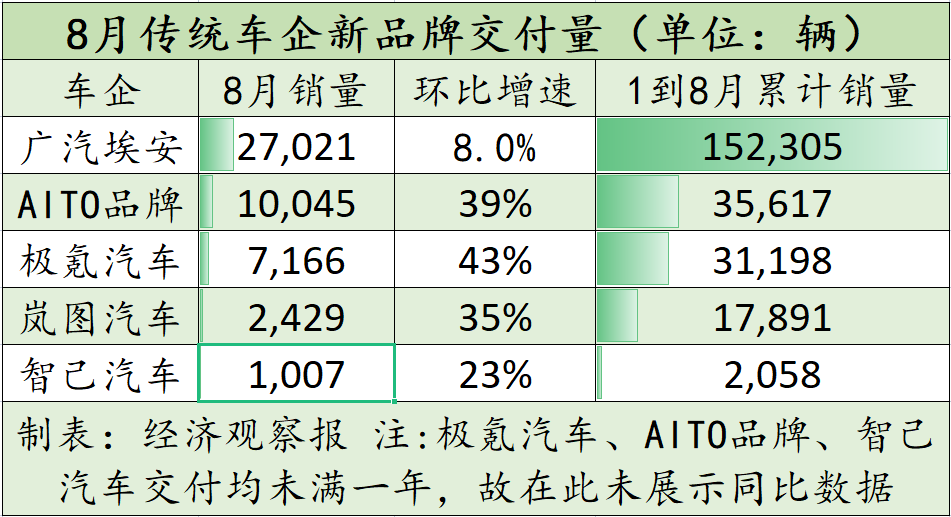 如下图经济观察报统计的数据显示,传统车企的新品牌环比增速都还不错,就连体量最大的广汽埃安,也有8%的环比增速,8月销量27021辆,前8月累计152305的销量,一骑绝尘。