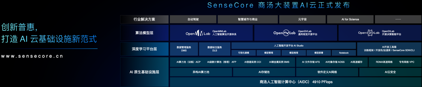 对此,商汤打造了SenseCore商汤AI大装置,该装置由计算基础设施、深度学习平台及模型层构成,通过打通算力、算法和平台,推动人工智能进入工业化发展阶段。
