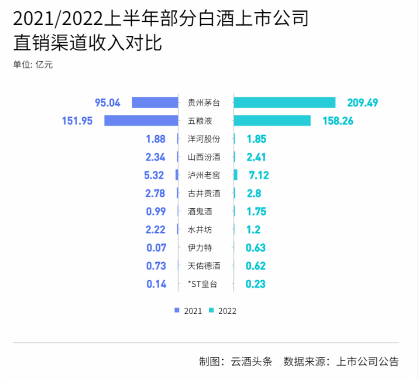 例如,业绩稳居三甲的洋河股份,在2022年上半年,实现直销收入1.85亿元,同比下降1.47%;经销收入达183.33亿元,同比增长22.49%;其经销渠道在总营收占比达99%。