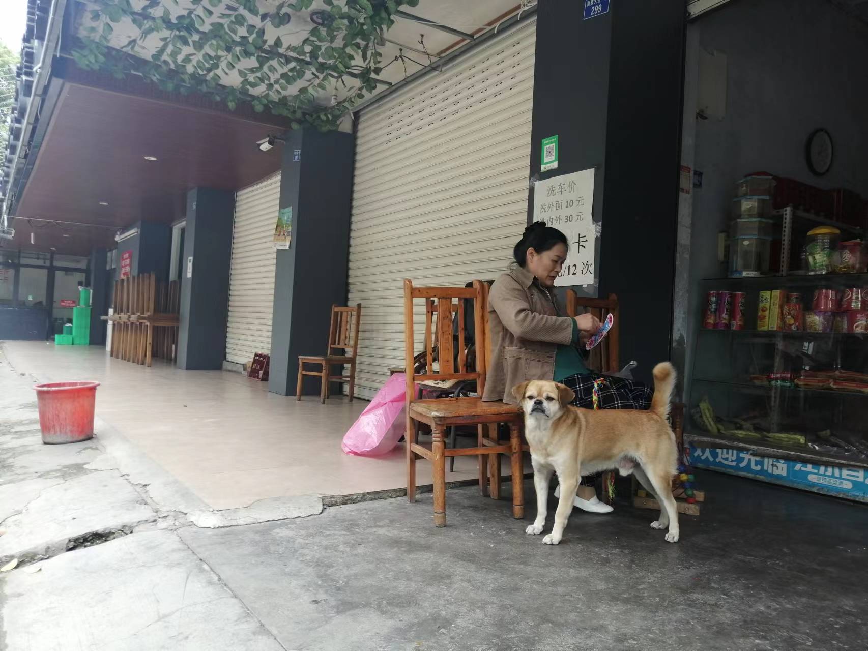 “原则居家”期间,一些人流量较大的餐馆已经歇业,但人流较小的店面仍可以继续营业。南熏大道附近,一家副食小店里,店主和自己养的狗相互陪伴,周围少有行人。