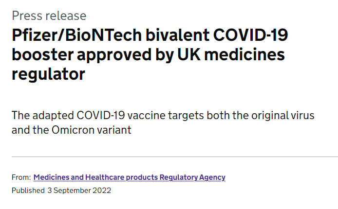 英国药品和医疗产品监管署(MHRA)9月3日发布声明,宣布批准辉瑞/BioNTech二价新冠疫苗用于12岁及以上人群。
