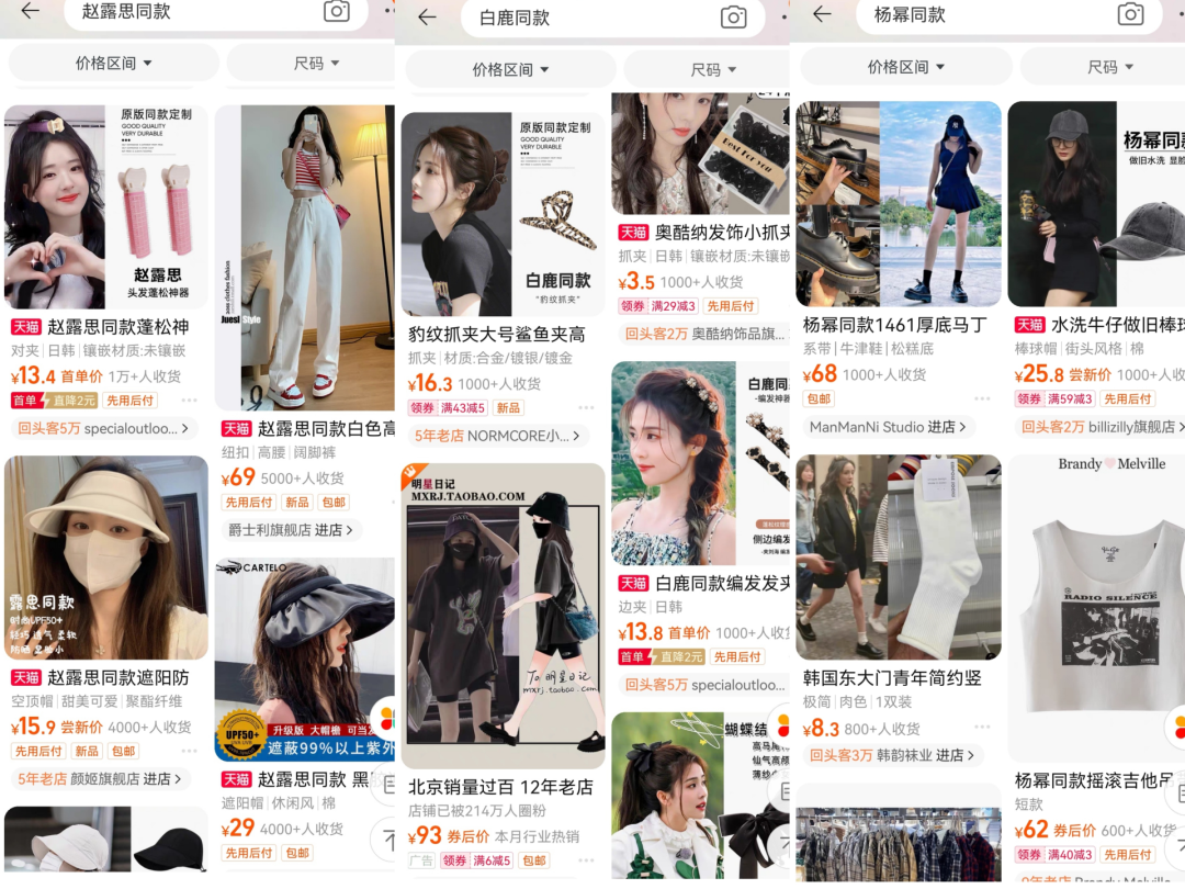 娱子酱搜索后发现,赵露思、白鹿二人淘宝同款销量最高,出现月销量过万的单品和大批1000+月销产品,并不弱于传统概念里的带货女王杨幂。