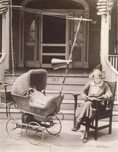 收音机婴儿车(美国,1921年) 配备收音机的婴儿车,包含了天线和喇叭,用来让婴儿安静。