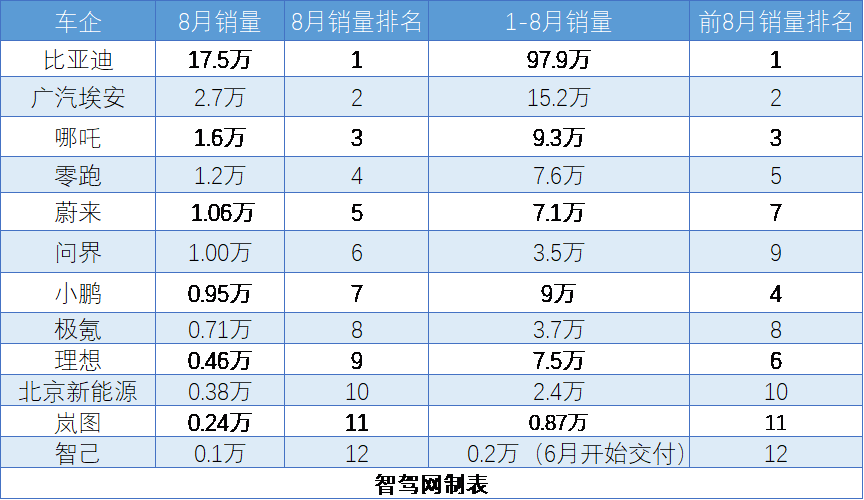 排名靠前的哪吒和零跑分别以16017辆、12525辆的成绩位列第一、第二,蔚来交付10677辆排名第三。