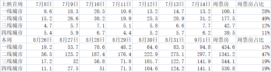 毒眸统计了《隐入尘烟》上映首周和本周的票房城市分布,发现三四线城市在此轮票房增长中是绝对的主力。从8月26日三四线城市还不如一线城市的票房,到9月1日均已经达到了一线城市的1.5倍,而在首周的时候,大约只有0.5倍。