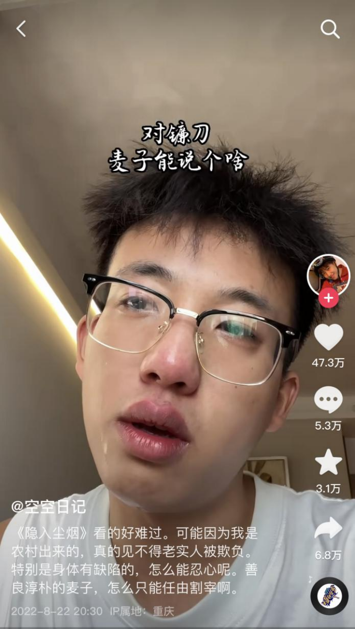 熟稔新媒体传播规律的短视频博主们,知道什么切入点更能博人眼球。有的博主抓住“他一辈子没吃过鸡蛋,唯一一次是为了冲淡农药的苦”这一细节,激起用户的同情与愤慨;有的博主只是对着屏幕哭了一通,抛出一个“《隐入尘烟》后劲有多大”的话题,就能激起不少用户的好奇;有的博主甚至发起“小麦印花”挑战,模仿主角马有铁在自己的手上印花,但没有小麦的博主们只能用大米或玉米代替。