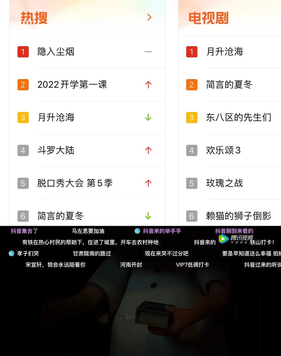事实也证明,好电影不怕曝光。在8月初登陆流媒体平台后,《隐入尘烟》的线上热度也一直延续至今。截至发稿前,腾讯视频的热搜榜一仍是《隐入尘烟》,超过诸多热播剧集。打开视频,首先映入眼帘的弹幕是“半夜刷抖音来的”。