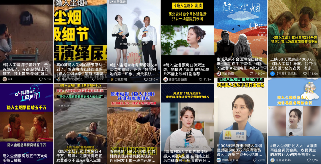 需要指出的是,与《明日战记》等影片不同,以《隐入尘烟》的票房量级和宣发投入来看,此次《隐入尘烟》的逆袭与片方自主策划的营销行为关联并没有那么明显,更像是抖音博主的自主选题。