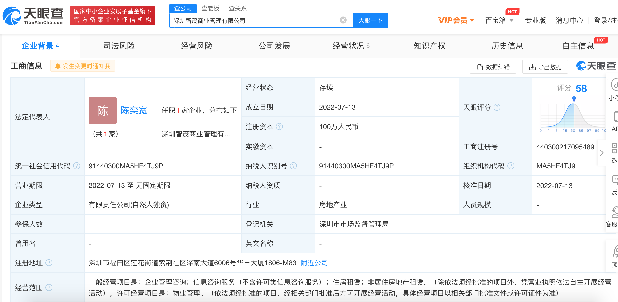 查阅深圳智茂商业管理有限公司,显示其成立于2022年7月13日,注册资本100万元,由自然人陈奕宽100%持股,陈奕宽也无其他持股记录。深圳智茂商业管理有限公司位于广东深圳,是一家以从事房地产业为主的企业。一家刚成立注册资本100万元的公司,拿出10个亿来拍卖,这背后该有其不为人知的逻辑。