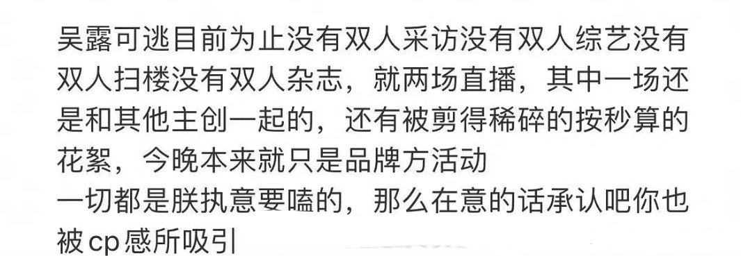 一段广为流传的话是,“吴露可逃目前为止没有双人采访没有双人综艺没有双人扫楼没有双人杂志……一切都是朕执意要嗑的,那么在意的话承认吧,你也被CP感所吸引。”