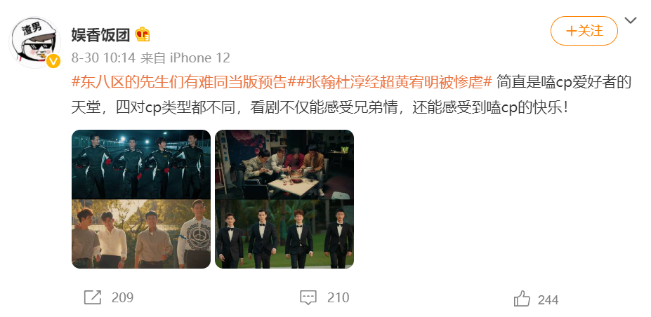 最近播出的男性群像剧《东八区的先生》,在发布预告当天,营销号联动发布的内容都是“看剧不仅能感受兄弟情,还能感受到嗑CP的快乐”。