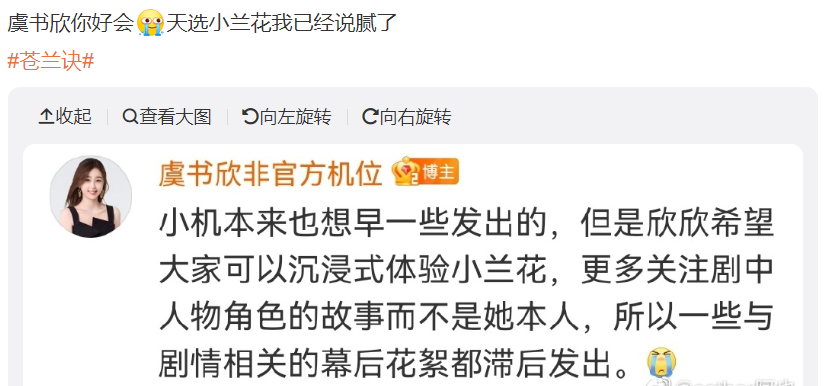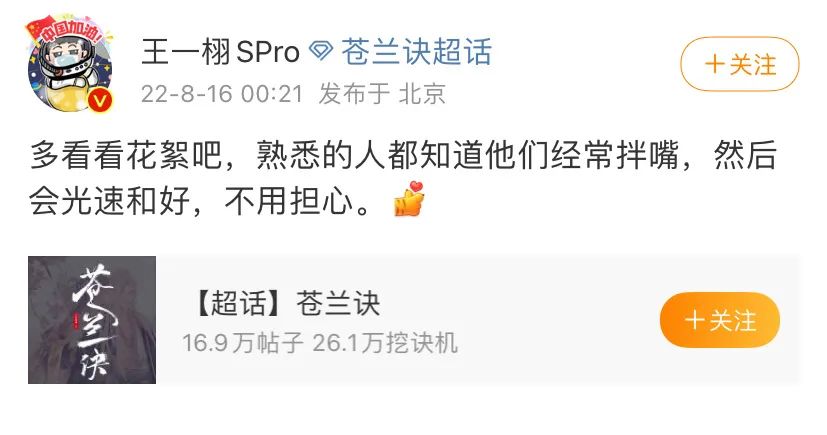 这种“吵架”似乎不是所有观众都吃的桥段,甚至有不少人因为直播的不欢而散而表示“下头”。《苍兰诀》制片人、恒星引力CEO王一栩火速在剧集超话回应:“熟悉的人都知道他们经常拌嘴,然后会光速和好,不用担心。”他还在下方回复了一位网友:“已经哄好了。”