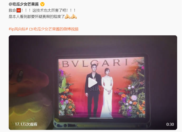 在王鹤棣和虞书欣的CP超话“棣欣引力”,和吴磊和赵露思的CP超话“吴露可逃”里,这五个字都会高频出现。跟在这句话下方的,往往是粉丝们PS的合照、在物料里找到的、证明“两人可能在谈”的所谓“糖点”,“吴露可逃”粉丝甚至做出了一个两人在宝格丽活动上同框的视频,以假乱真。