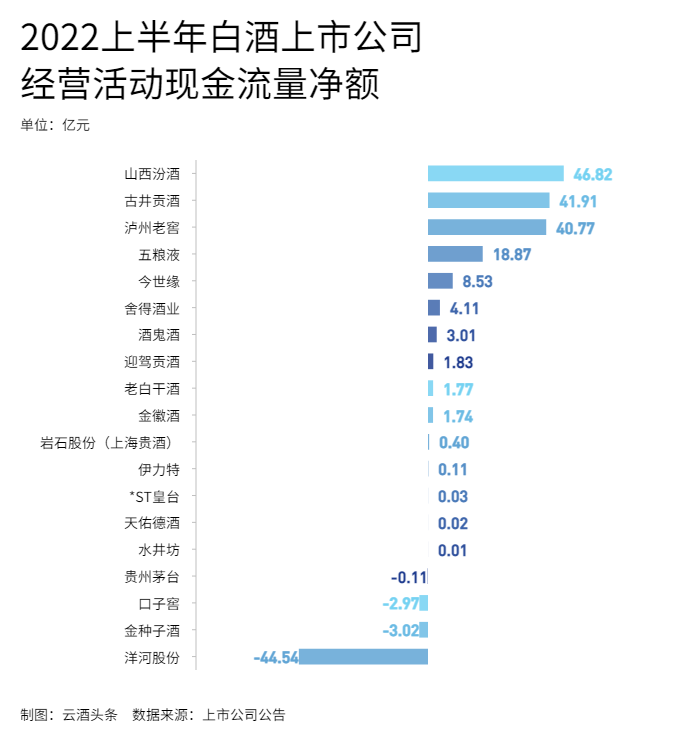云酒头条统计19家白酒上市公司半年报发现,从经营性现金流来看,各家企业呈现出了非常大的差异。