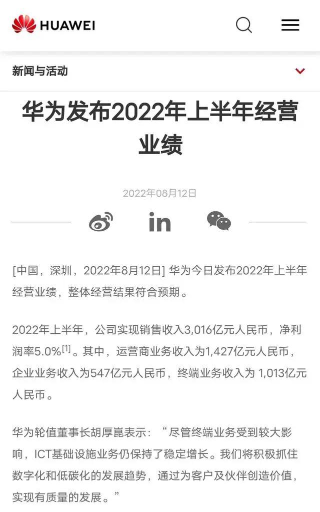然而这还不是终点,2022年8月12日下午,华为官网悄然披露2022年上半年的财报,营收3016亿元人民币,净利润为5.0%,同比下跌4.8%,其中华为运营商以及企业业务营收分别增长4%和27%,终端业务下跌25%。