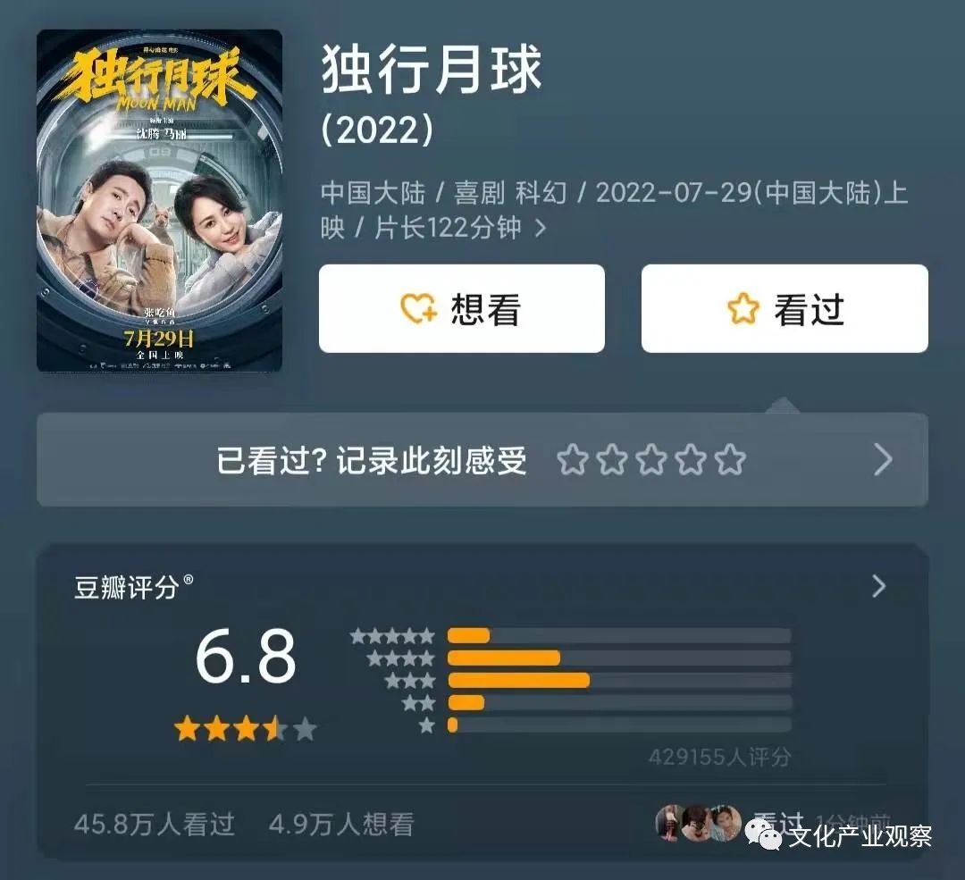 最后再看口碑。暑期档电影豆瓣过7分的只有《人生大事》《新神榜·杨戬》《隐入尘烟》三部,并且《隐入尘烟》票房4000万,而票房冠军《独行月球》评分才6.8,更有甚者还有通过“卖惨”来换取票房的现象。这也说明,虽然今年票房可观,但观众反响却平平。