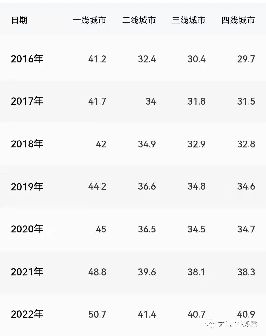 二、三、四线城市的平均票价为38.68元、37.11元、37.33元。其中,三四线城市的平均票价较2022年同期涨幅在15%左右。
