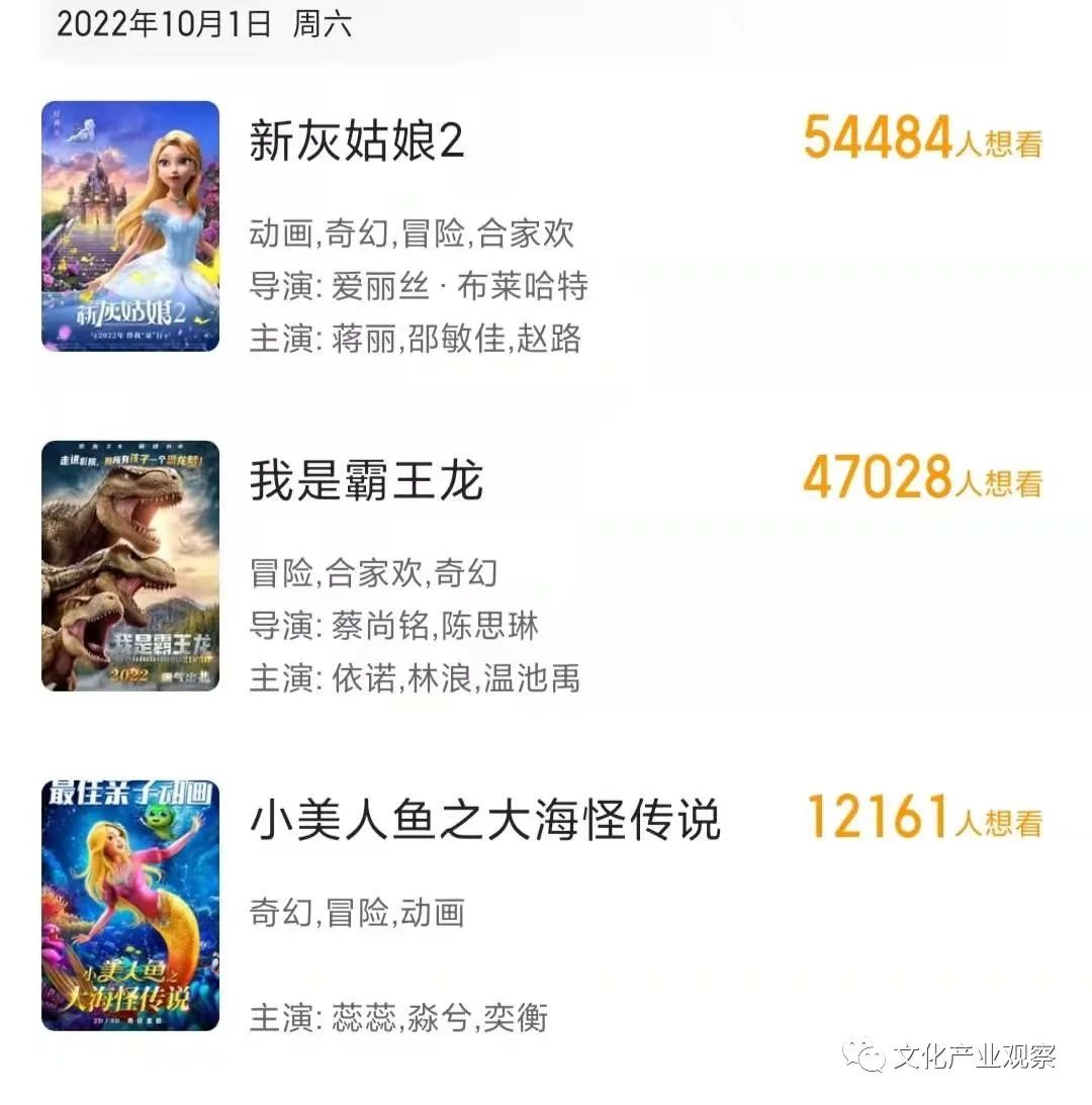 目前国庆档只有《我是霸王龙》《新灰姑娘2》和《小美人鱼之大海怪传说》三部动画电影定档。博纳影业出品的《无名》、光线传媒主控的国漫电影《深海》、中国电影参与出品的《长空之王》、华策影视出品的《万里归途》被认为是最有可能空降国庆档的几部影片,但目前仍是没有音讯。