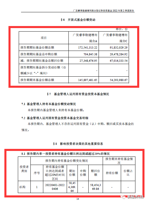据广发睿享稳健增利今年2季报披露,报告期末基金(A/C份额)总份额约2亿份,基金合计资产值为21051.03万元。从基金份额变动情况来看,广发睿享稳健增利今年二季度被净赎回6418.18万份,较期初份额26437.33万份,赎回率超过两成,达24.28%。相较基金募集时的357653.15万元,该基金成立逾三年来规模已骤降超过九成,高达94.11%。