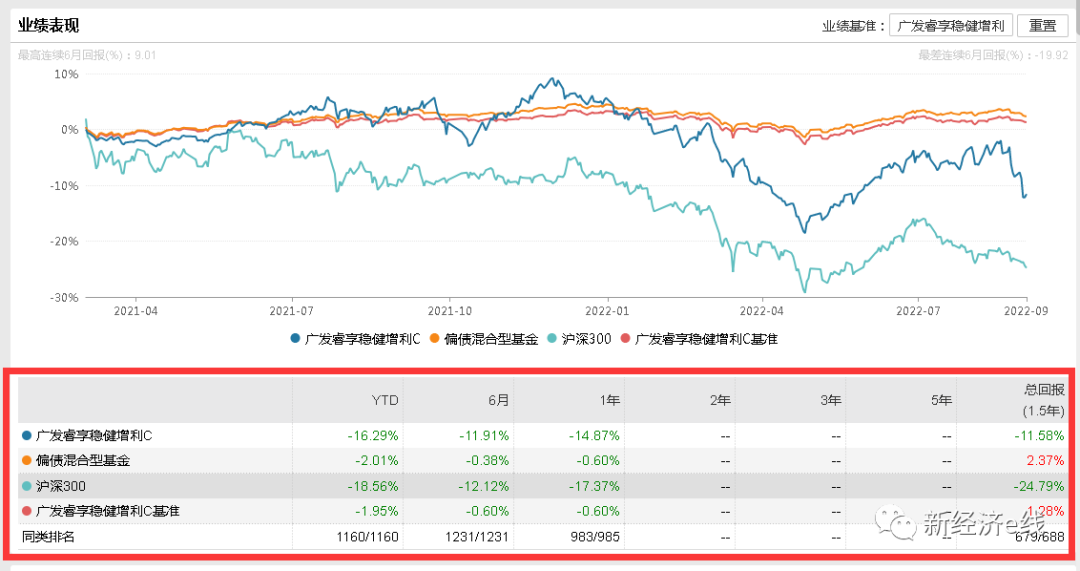 在偏债混合型基金中,广发睿享稳健增利C(011702)和广发睿享稳健增利A(007251)单位净值分别是0.9753元和0.9769元,成立三年多来仍在面值以下徘徊。Wind统计表明,截至9月2日,今年来该基金C类和A类的净值回报率为-16.29%和-16.23%,在同类基金分别位列倒数第一和倒数第二,同类排名各为1160/1160和1159/1160。