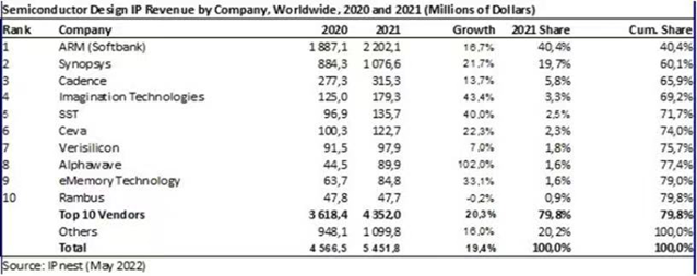 就半导体IP竞争格局而言,英国ARM公司和美国新思科技2021年以40.4%、19.7%(2020年分别为41%和19.3%)的高市占率稳居全球第一、第二位置,中国大陆仅有芯原股份以3.3%的全球市占率挤进前十名。