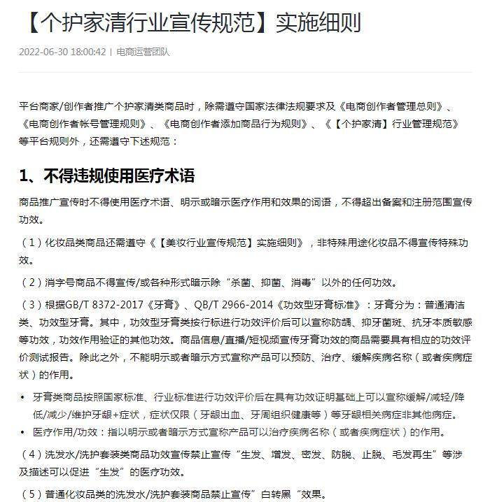 据青眼不完全统计,仅今年以来,抖音平台已先后发布了近10条与化妆品行业相关的通知或细则。如,其在今年4月21日发布了【儿童化妆品类】商品发布及宣传细则,其中对儿童化妆品商品的发布流程和宣传内容进行了规范;今年6月30日发布的【个护家清行业宣传规范】实施细则,则要求商家/创作者推广个护家清类商品时,不得违规使用医疗术语、不得夸大商品效果或规格等。
