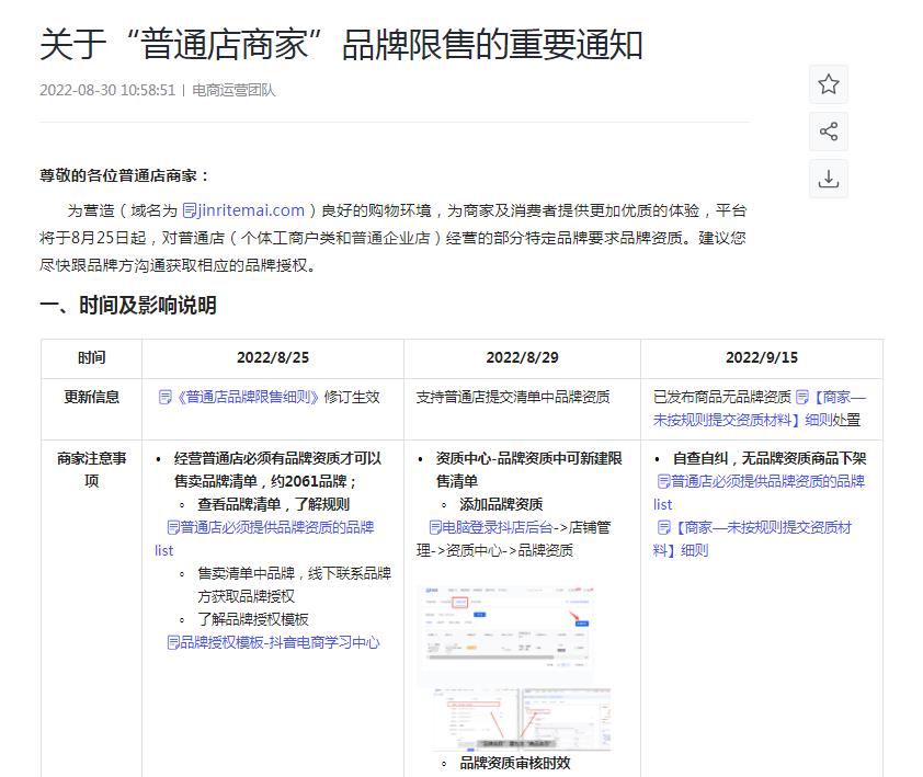今年8月25日,抖音发布了“普通店品限售细则”要求,“对于普通店,在经营部分特定品牌时,需提供相应的品牌资质方可经营该品牌商品。”直到8月30日再次发布上述通知,对具体操作步骤和惩处进行明确。