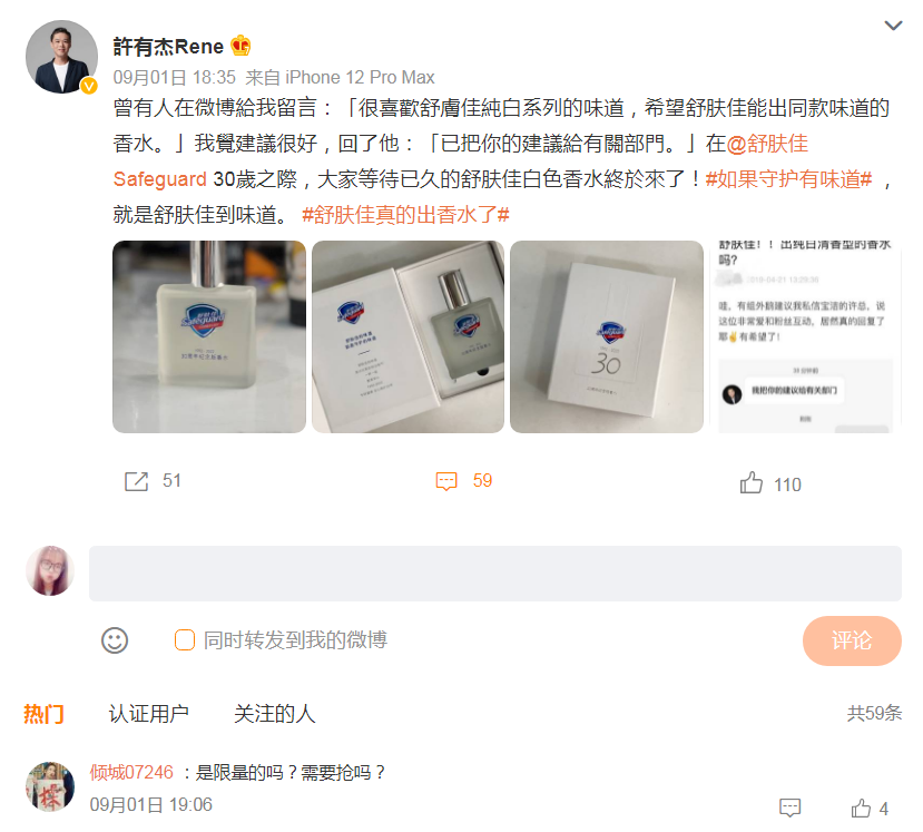 真正将舒肤佳香水的讨论热度推向高潮的,恐怕还是9月1日,宝洁大中华区传播与公关副总裁许有杰在微博上的一条推文。许有杰在微博透露,3年多前就有粉丝建议舒肤佳推与香皂同款味道的香水,现借舒肤佳品牌30周年之际正式推出一款纯白香味的香水。据了解,许有杰在微博拥有29.4万粉丝。