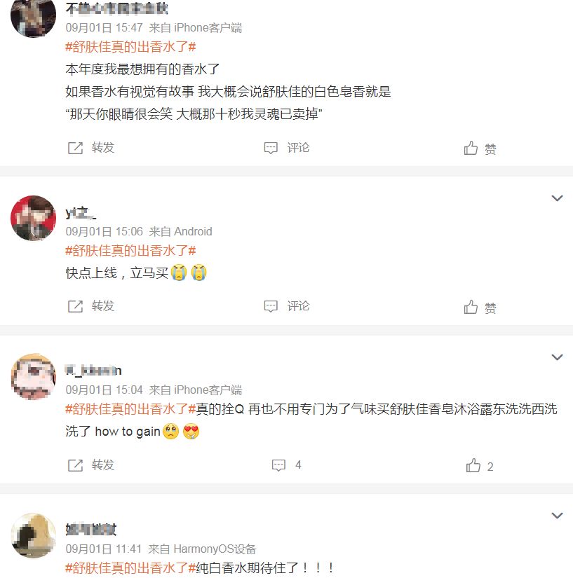 “希望舒肤佳推出更多气味的香水”,虽然此次舒肤佳发布纯白香水是为了纪念品牌30周年,但既然开了头,网友们热情高涨,呼吁品牌上线更多香水。对于品牌是否会规划香水线,青眼第一时间联系舒肤佳品牌方,对方回复称,暂时没有这个计划,本次推出的香水是舒肤佳30周年的纪念周边,以赠品的形式在天猫和抖音上线。