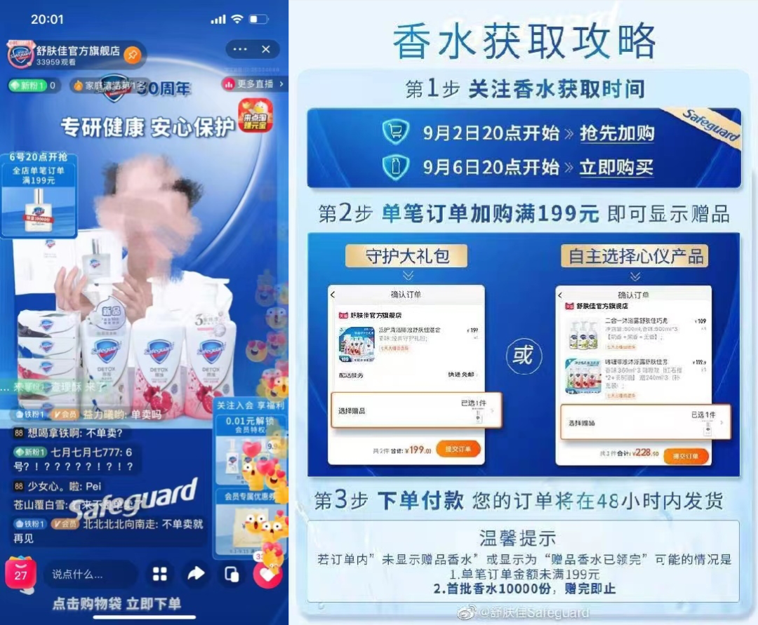 今日晚8点,青眼通过舒肤佳官方直播间直播间了解到,在全店单笔订单满199元或买指定199元的组合套装,即可于9月6日晚8点抢购纪念版舒肤佳纯白香水,首批香水限量1万份。据主播介绍,第二批香水将于9月12日在官网直播间与见面,目前仅此一款香型的香水。截至发稿,直播有6万观看量,远高于9月1日2.9万的观看。