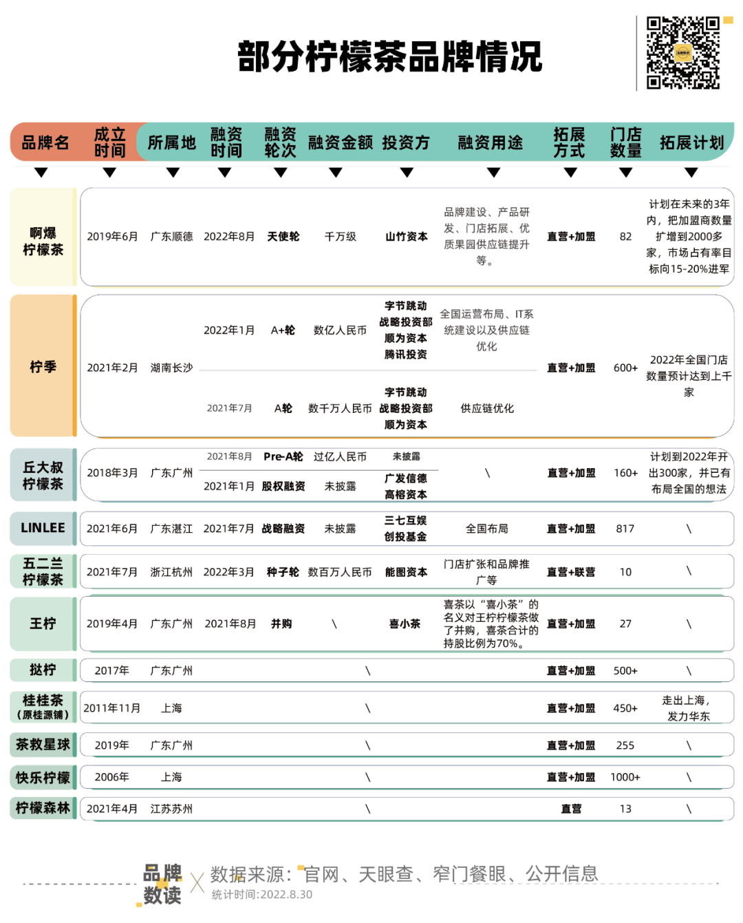 行业对时间窗口的判断不尽相同,但是招徕加盟商快速扩展却成为了共识。啊爆柠檬茶、柠季、LINLEE、五二兰柠檬茶、TANING挞柠等品牌均开放加盟,全直营的品牌也有丘大叔、柠檬森林等品牌,相较而言是行业内的另类。