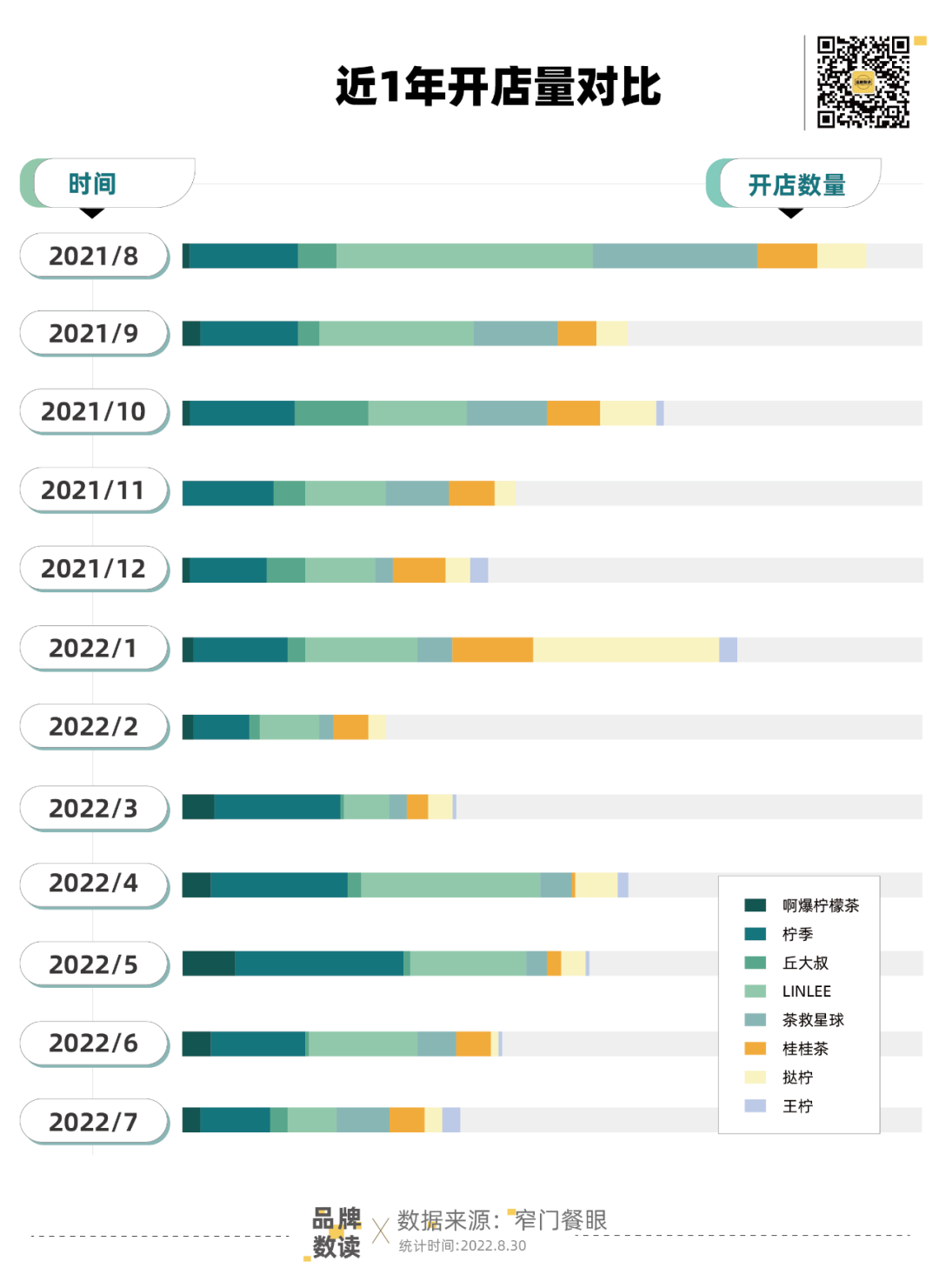 尤其进入夏季,柠檬茶进入扩张旺季。根据窄门餐眼数据,柠檬茶品牌的门店扩张呈现阶段性,2021年4月至2022年10月进入开店旺季,品牌数读选取了11家柠檬茶品牌样本(包括啊爆柠檬茶、柠季、丘大叔柠檬茶、LINLEE、五二兰柠檬茶、王柠、挞柠、桂桂茶、茶救星球、快乐柠檬、柠檬森林)每月开店总数接近百家。值得注意的是,今年2月,挞柠反季新开了53家门店,一举拉高冬季柠檬茶拓店的上限。
