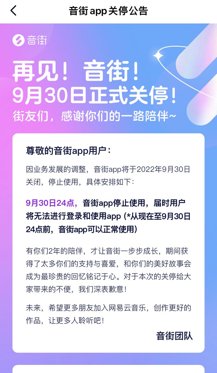 网易云音乐旗下K歌App“音街”日前发布公告称,因业务发展的调整,音街App将于2022年9月30日关闭,届时用户将无法进行登录和使用App(从现在至9月30日24点前,音街App可以正常使用)。目前,音街App的相关功能(K歌、歌房)均可在网易云音乐使用。