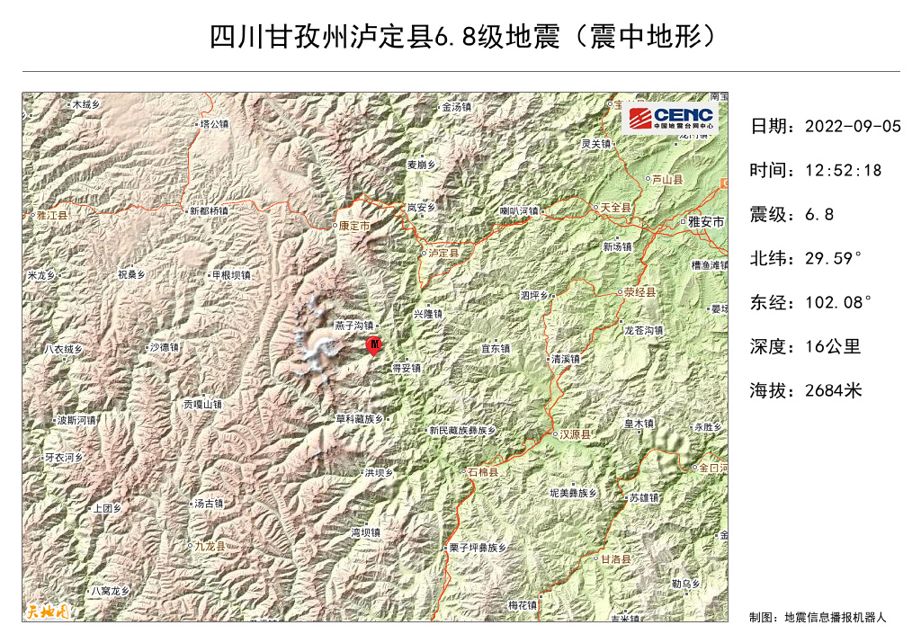中国地震台网正式测定:2022年9月5日12时52分在四川甘孜州泸定县(北纬29.59度,东经102.08度)发生6.8级地震,震源深度16千米。