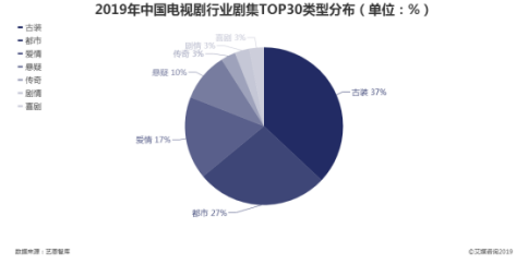 古装剧的热度自产出比例就可见一斑。即使在“限古令的影响下,”从2019年中国电视剧行业剧集TOP30类型分布来看,还是古装类型的聚集占比最高,为37%;其次是都市剧占比为27%;而喜剧、剧情和传奇类型的占比最低,且都为3%。