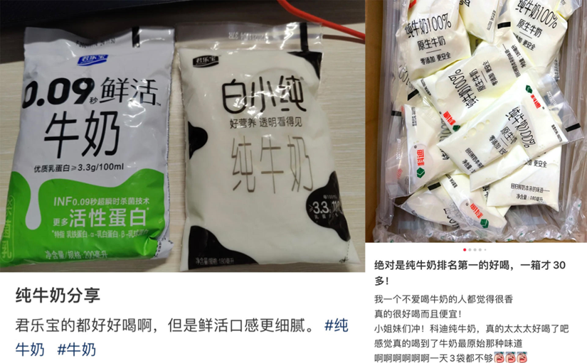 河北的君乐宝和科迪从定位包装和受众路线都像双生姐妹,透明袋装奶是科迪“小白奶”一跃成为网红的关键记忆点。