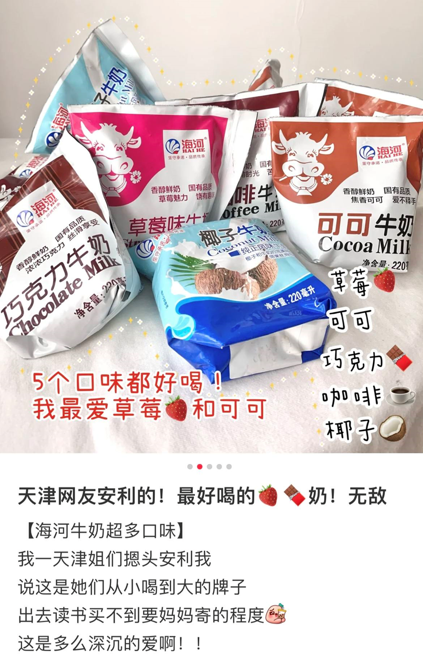 海河牛奶之于天津人,等同黄桃罐头之于东北人,是限定于一个区域内的送礼佳选。天津朋友提及海河牛奶透露:“发小住院我给送了箱海河可可奶,发小喝完一袋直嚷着痊愈了,立马要出院。”