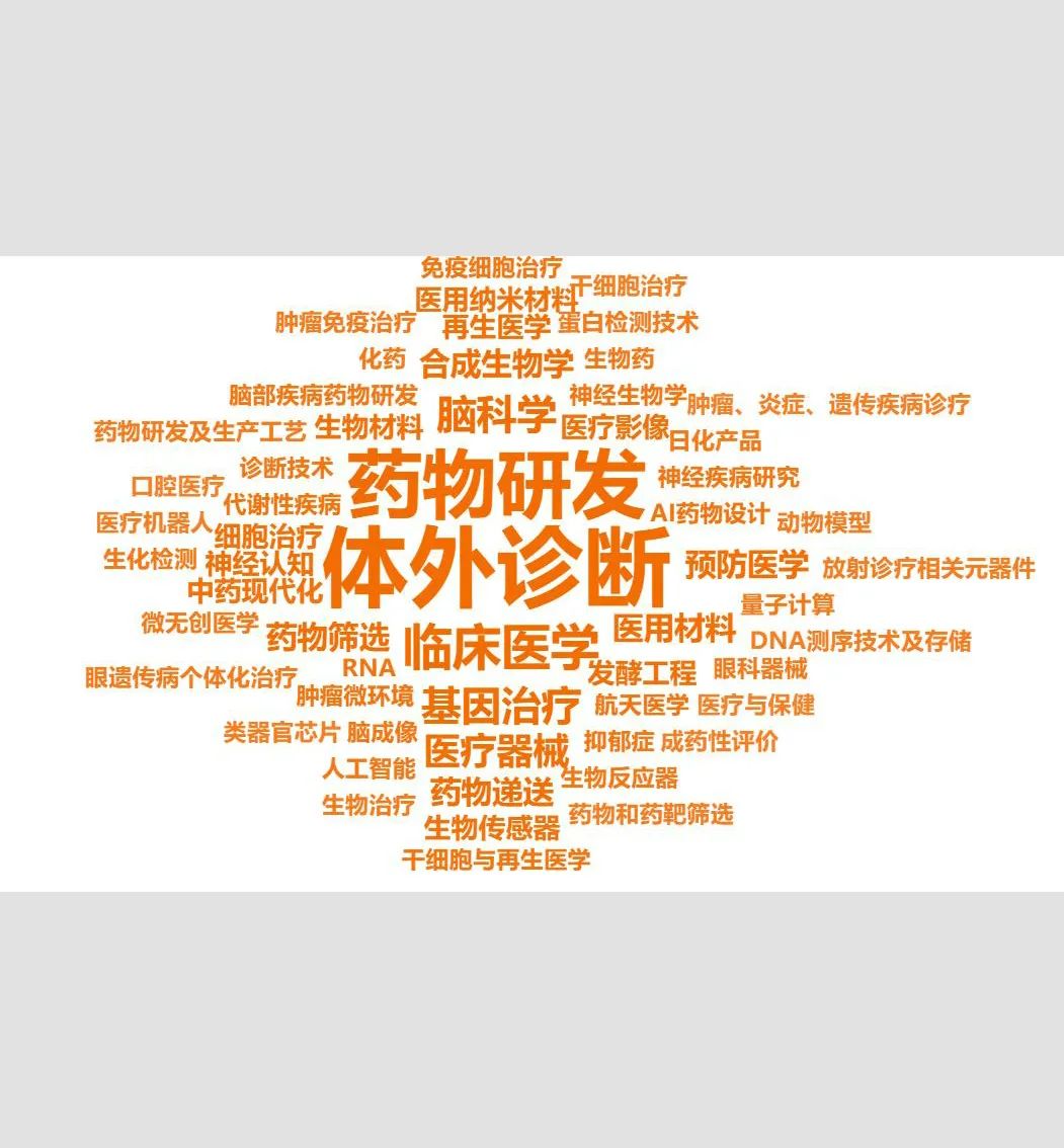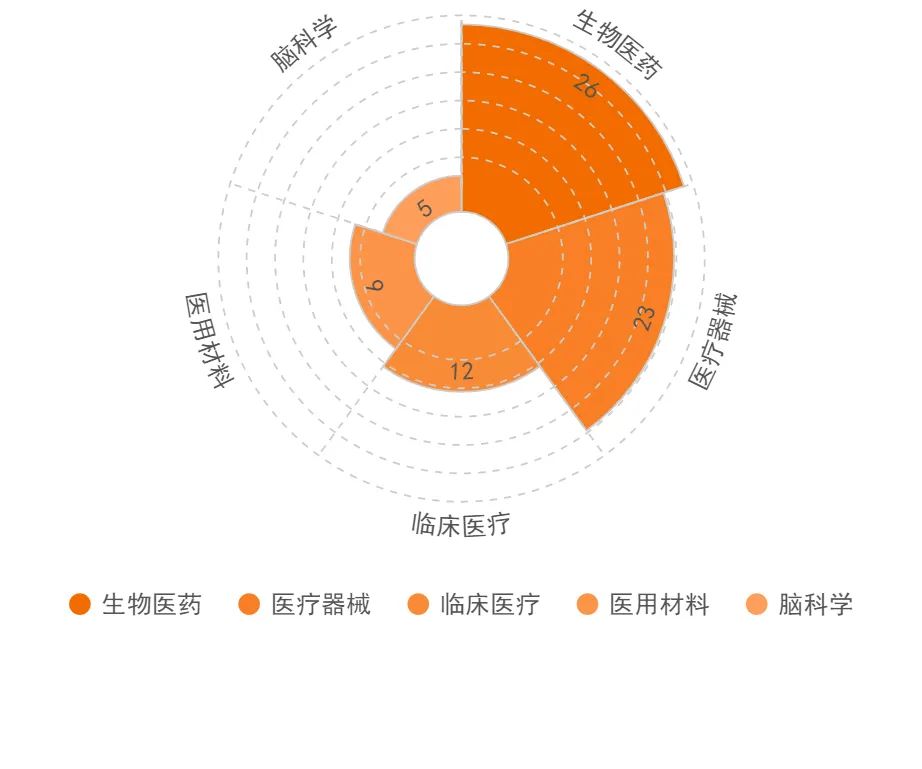 为了方便统计,我们粗略的将这些实验室的主要研究方向综合归类为生物医药(包含天然药物、生物药、化药研发及生产,生物治疗解决方案,合成生物学等生物技术为主导的技术领域)、医疗器械(包含体外诊断、医疗影像、生化检测等相关的医疗器械技术、产品及元器件研究)、临床医疗(临床医学研究)、脑科学、医用材料5个方向。从这些实验室的研究热力分布来看,生物医药相关的研究热度最高。