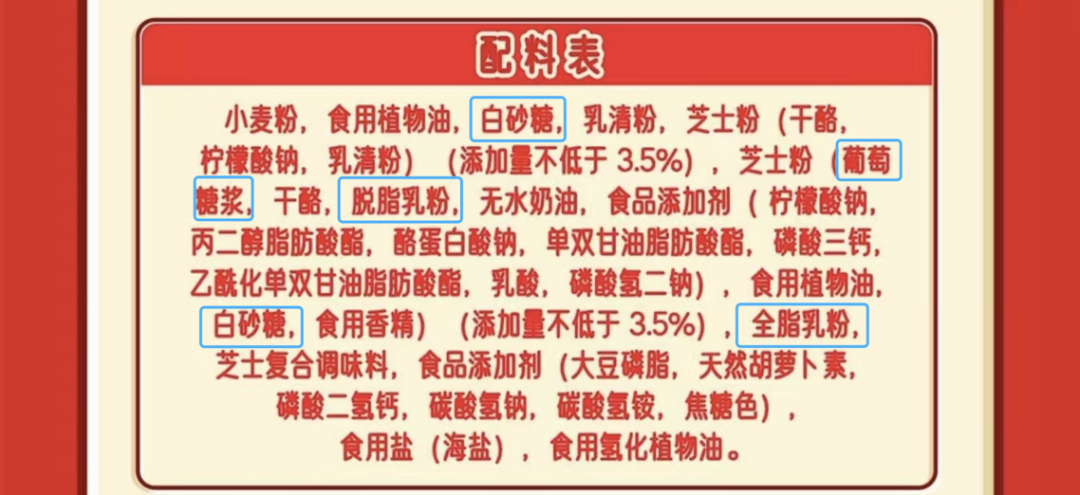 淘宝平台中一家网红进口饼干的配料表:白砂糖、葡萄糖浆、脱脂/全脂乳粉含有不同类型的“糖”