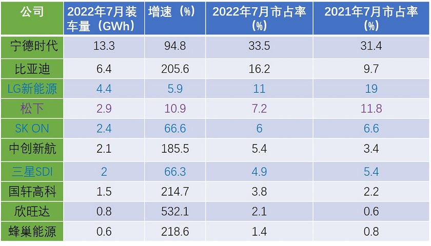 宁德时代7月依旧位居全球动力电池榜单第一,装机量逾13 GWh,但其33.5%的市占率,相较6月下滑2.5个百分点。