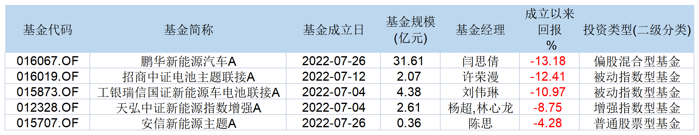 Wind数据显示,自7月1日至今,共有166只基金成立。其中,仅聚焦在新能源板块的基金就有5只,分别是鹏华新能源汽车、招商中证电池主题联接基金、工银瑞信国证新能源车电池联接、天弘中证新能源指数增强、安信新能源主题。